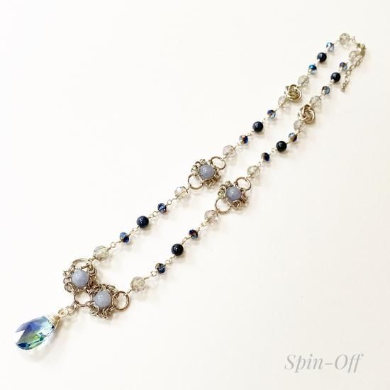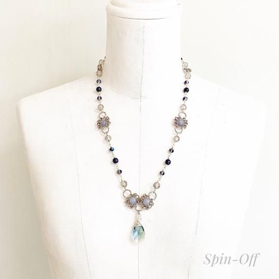 ブルーの天然石の周りやネックレス上部に配した大きめ丸カンの絡み方を見てください。