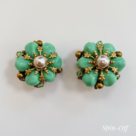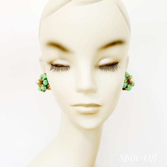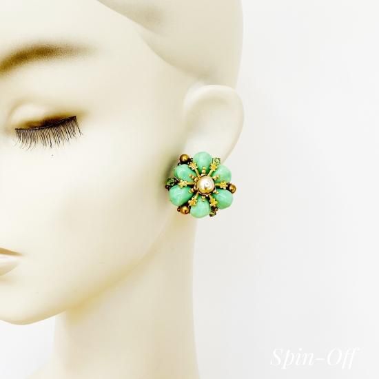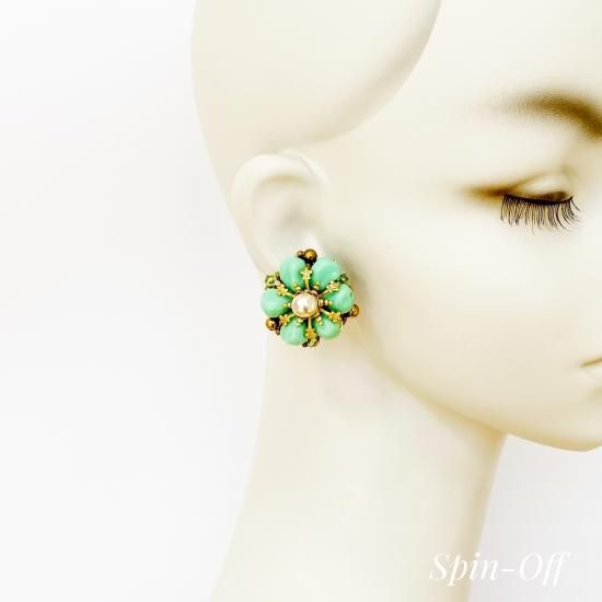 ターコイズグリーンのフラワーイヤリング。耳元にしっかり装着できます。