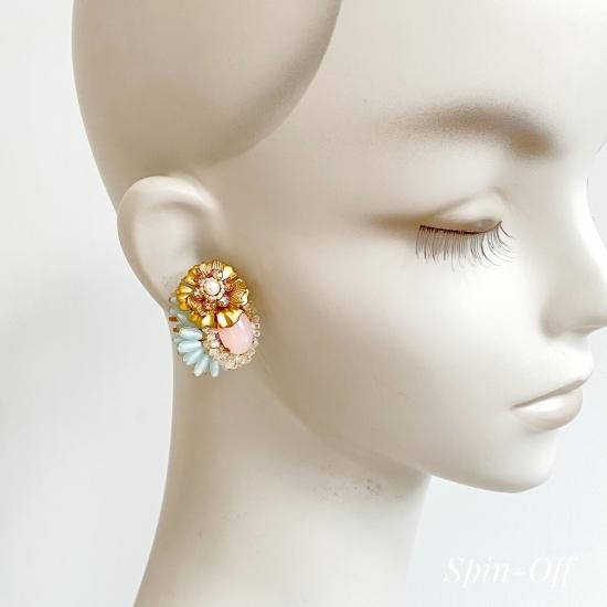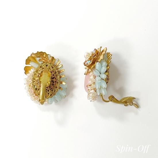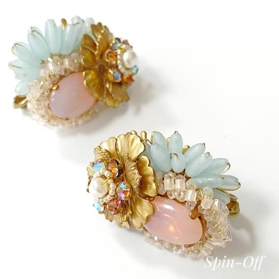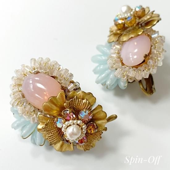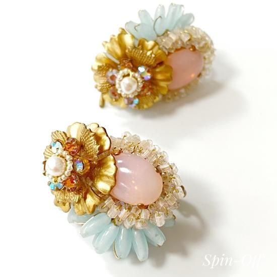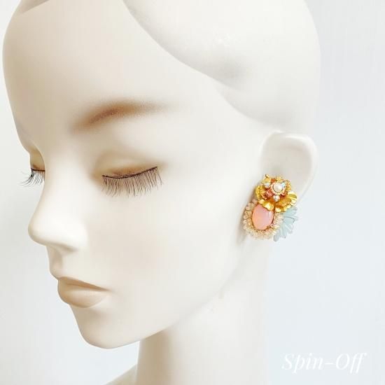 色調の淡いイヤリング。ピンクカボションがメイン。